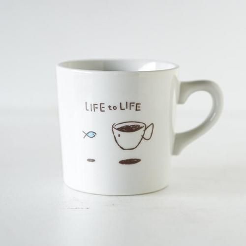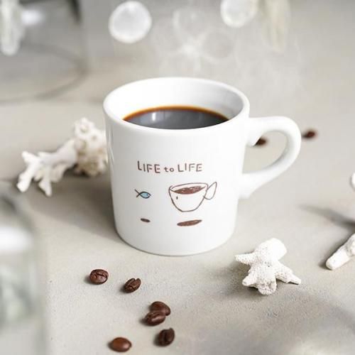 小さな魚と向かい合うように、まるで魚になったかのようなコーヒーカップが海にぷかりと浮かぶ、愛らしいイラストが特徴です。